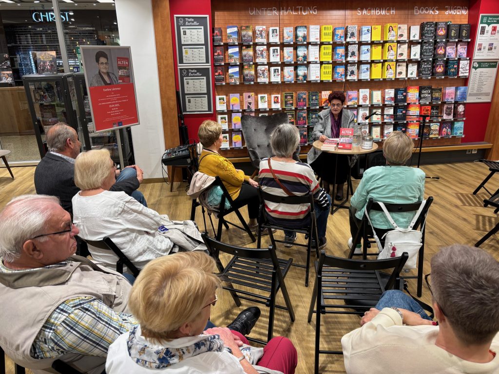 Die Botschaft lautet: Wehrt Euch gegen Ungerechtigkeit und gegen Diskriminierung wegen Alters! Die Besetzerinnen, die Ehrenmitglieder Margret Pollak, Ingrid Pilz und Brigitte Klotsche signierten mit Eveline Lämmer die frisch erworbenen Exemplare.  Vielen Dank an die Buchhandlung Thalia, die diese Lesung ermöglicht hat!“