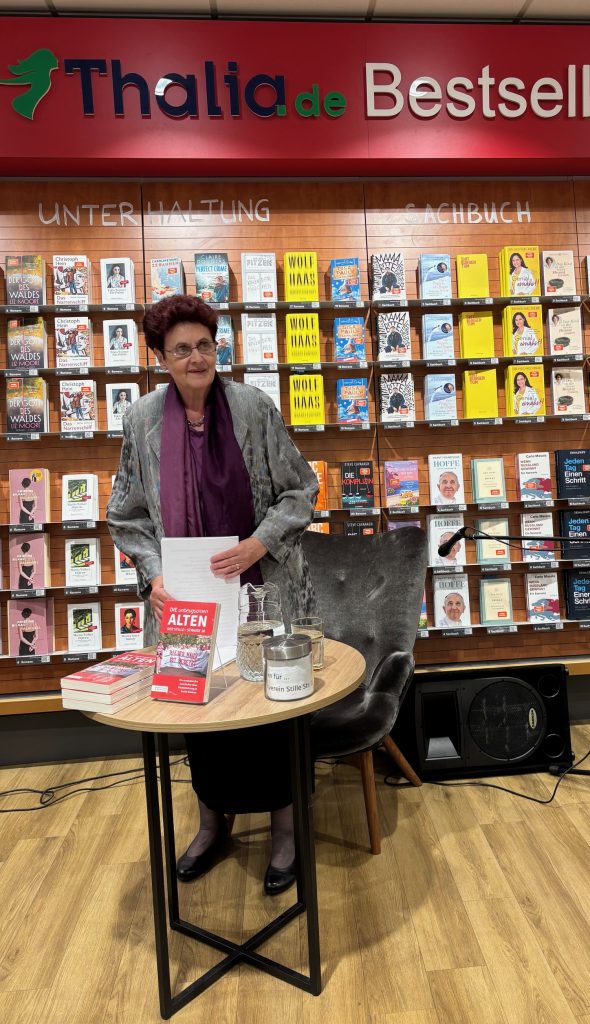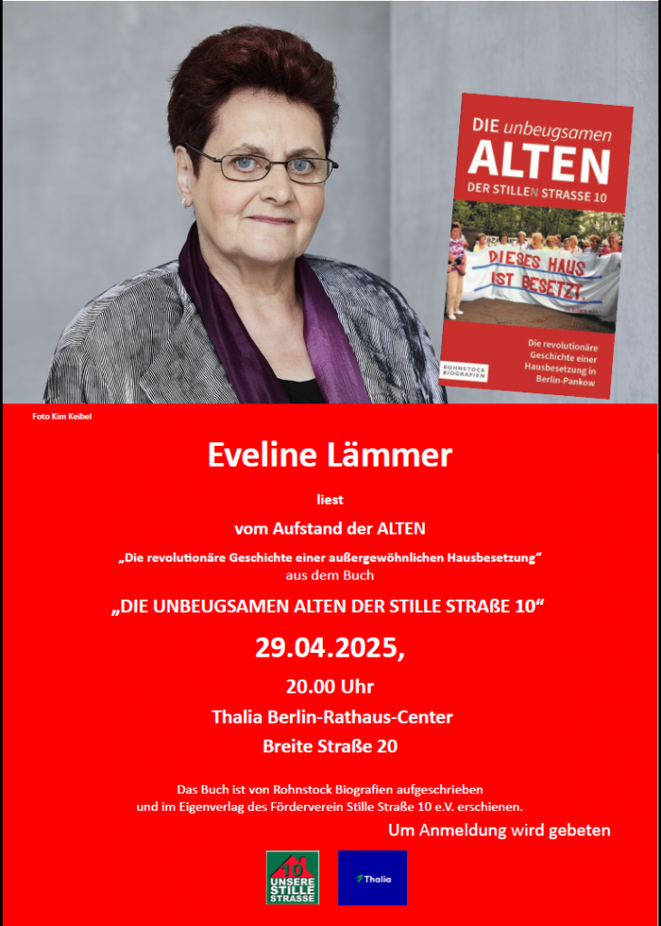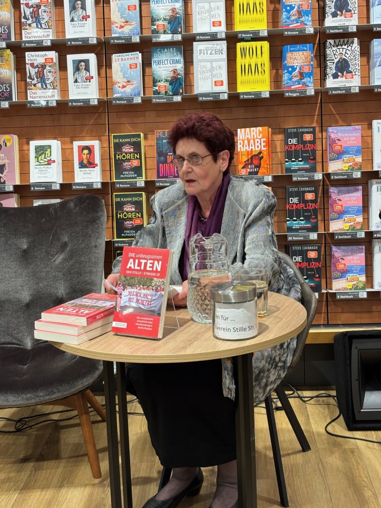 Am 29.04.2025 las Eveline Lämmer in der Thalia-Buchhandlung des Rathaus-Center Pankows aus dem Buch DIE UNBEUGSAMEN ALTEN der Stille Strasse 10. Sie erinnerte an die politische und gesellschaftliche Situation 2012 in Berlin, in der die Seniorinnen und Senioren ihre Begegnungsstätte besetzten, um sie zu retten.